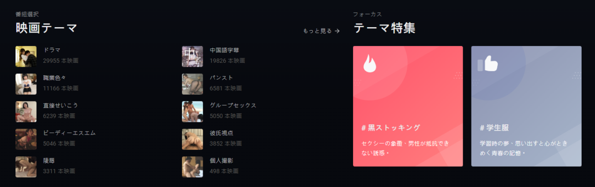 国内AV作品の圧倒的な掲載数と、ほぼフルバージョンで視聴できる点が非常に高く評価されている。